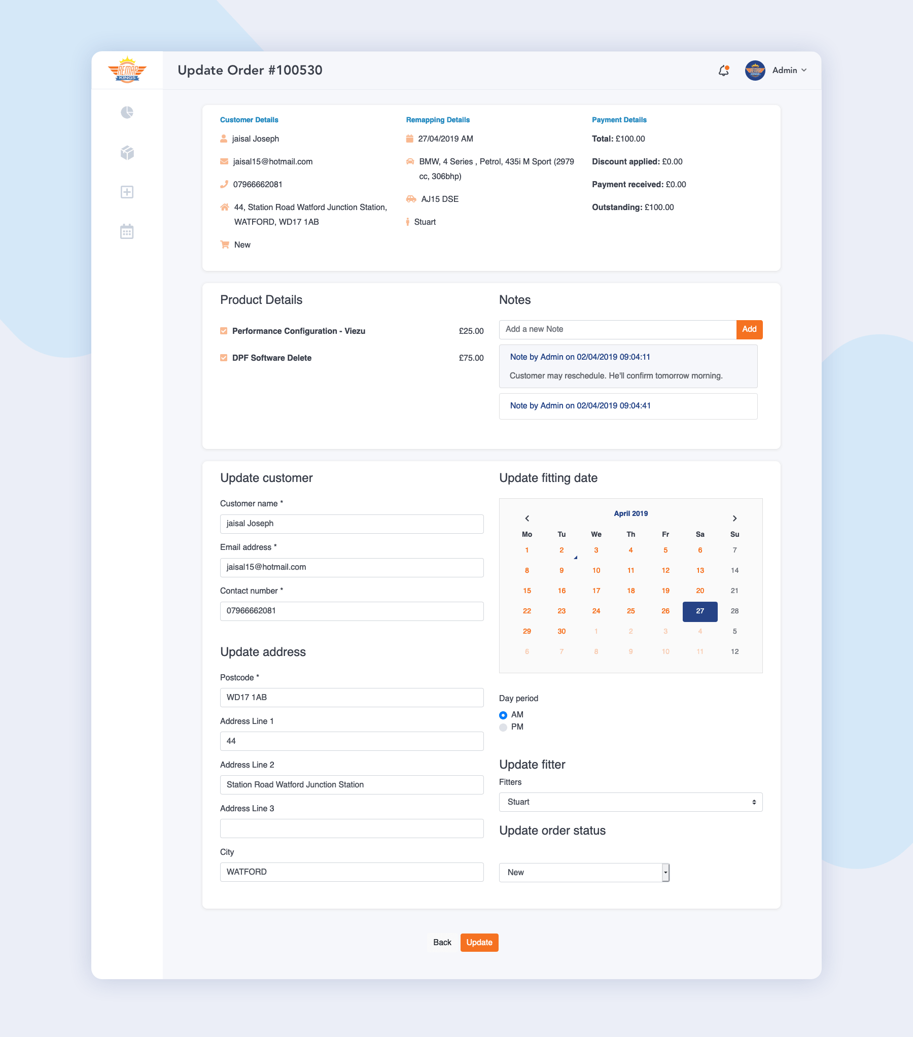 Fitters and admins can update customer orders as requested. We spoke to some garages and the main administrator. All agreed on having a "Notes" facility to improve communication. This way any important information can be recorded.