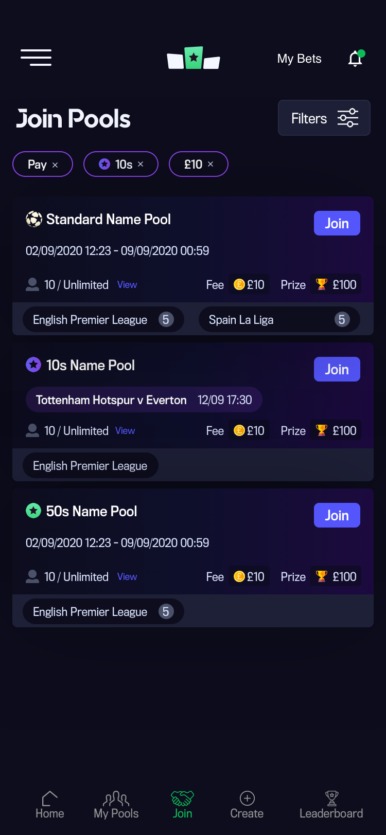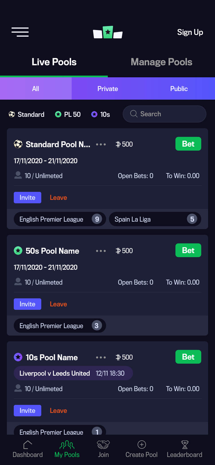 I won't go through the "Create Pool" section as that works as a mini app itself. Basically the user can create a pool by giving it a name, choosing matches and leagues and other settings, like making it private or public.