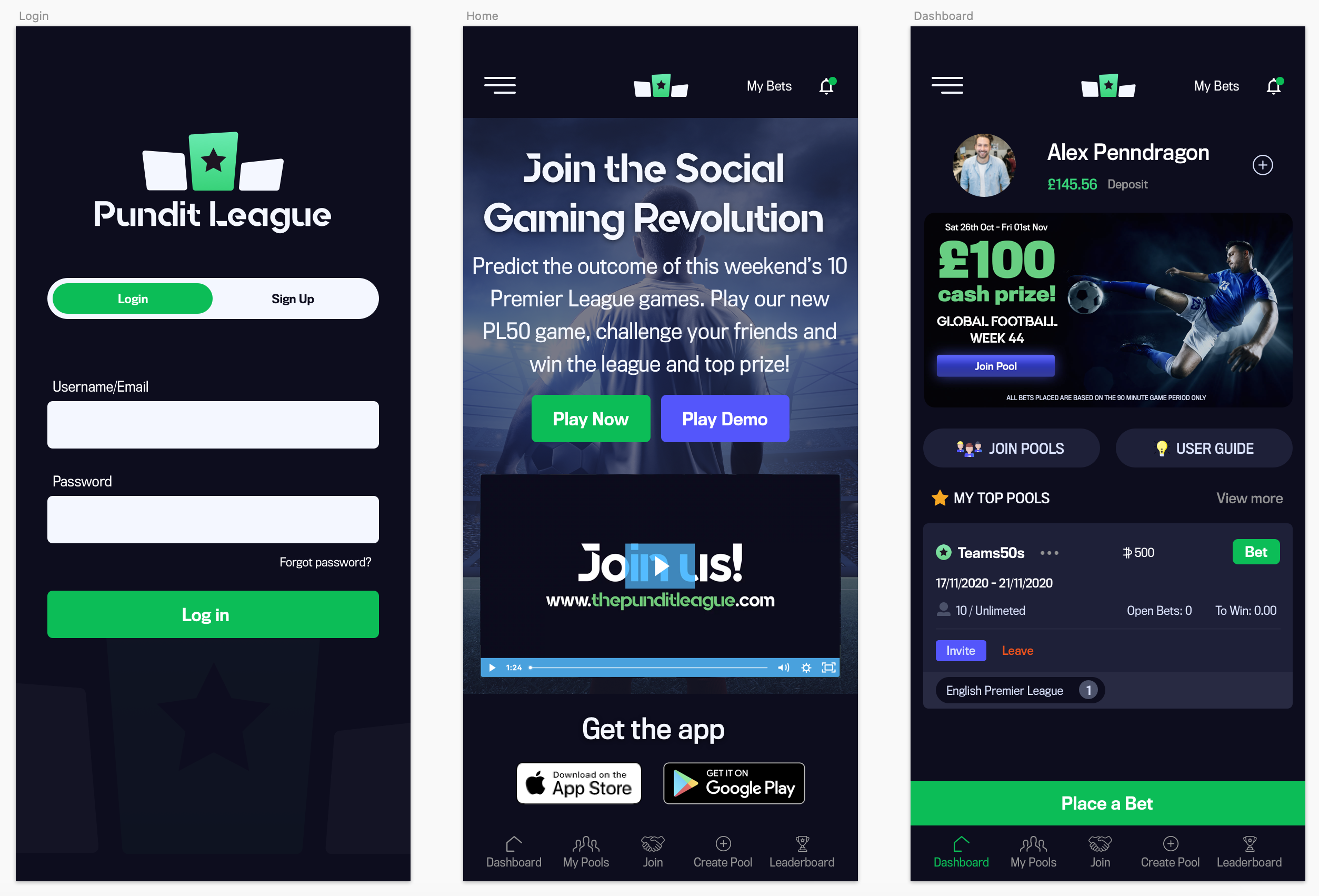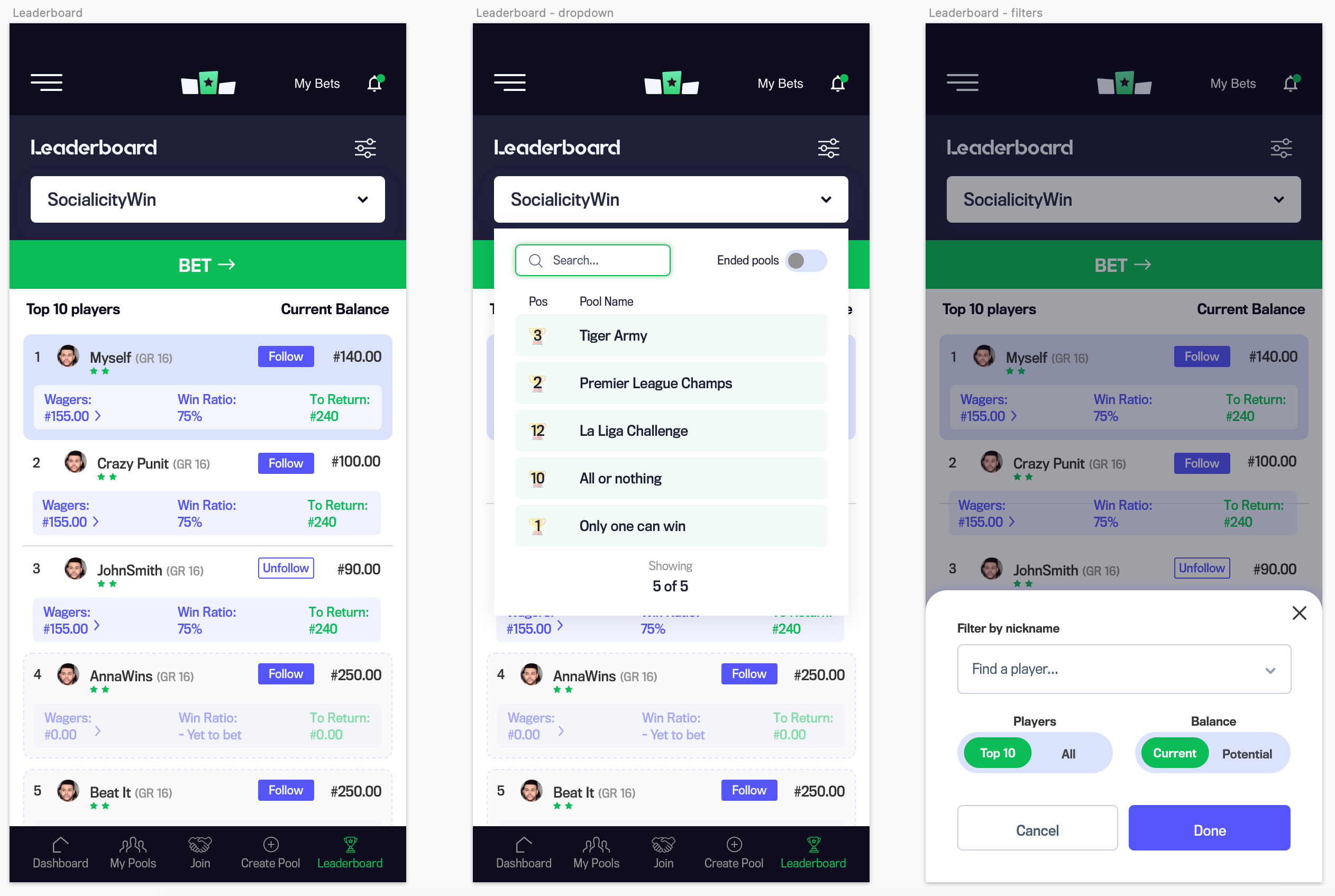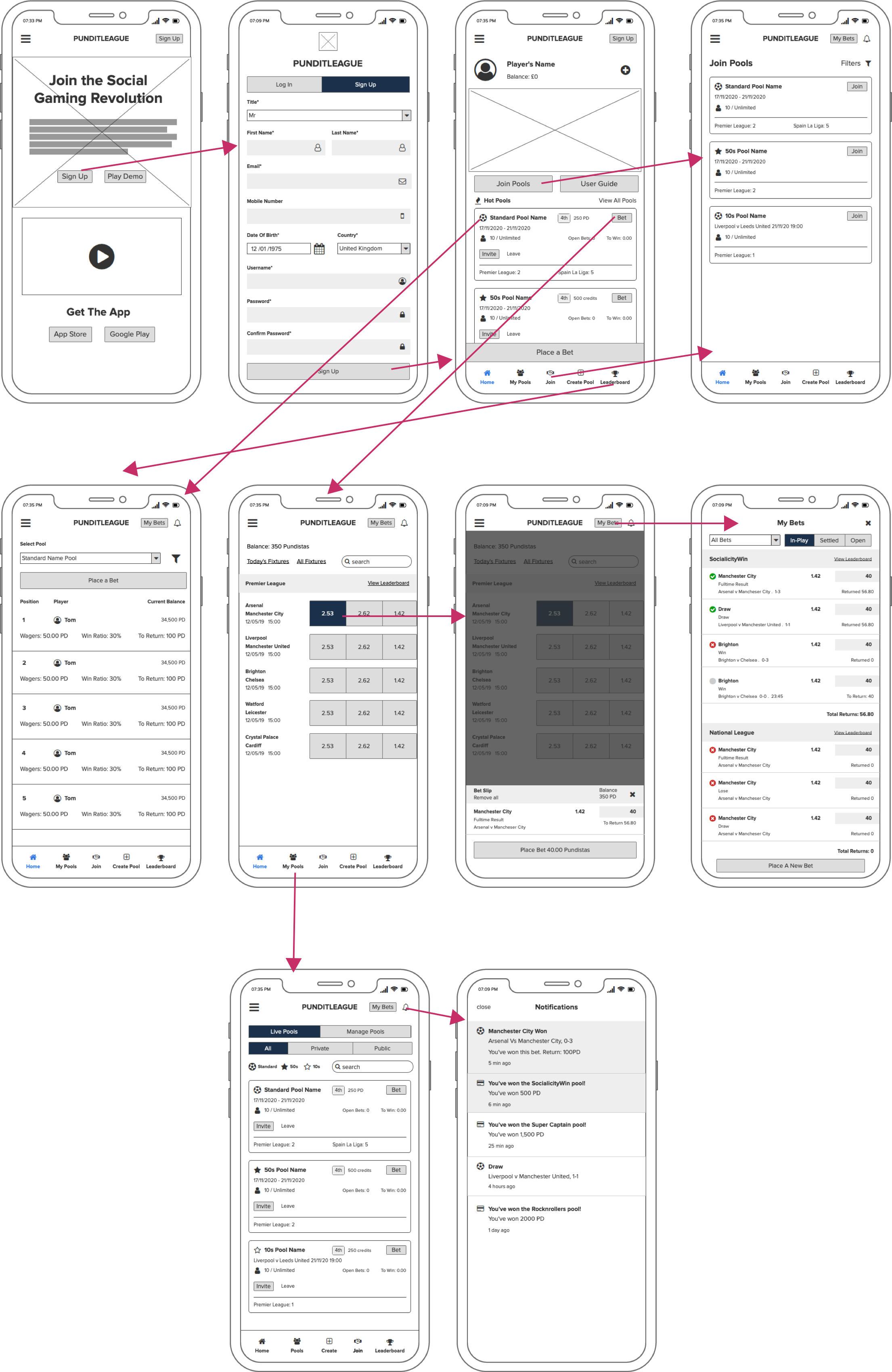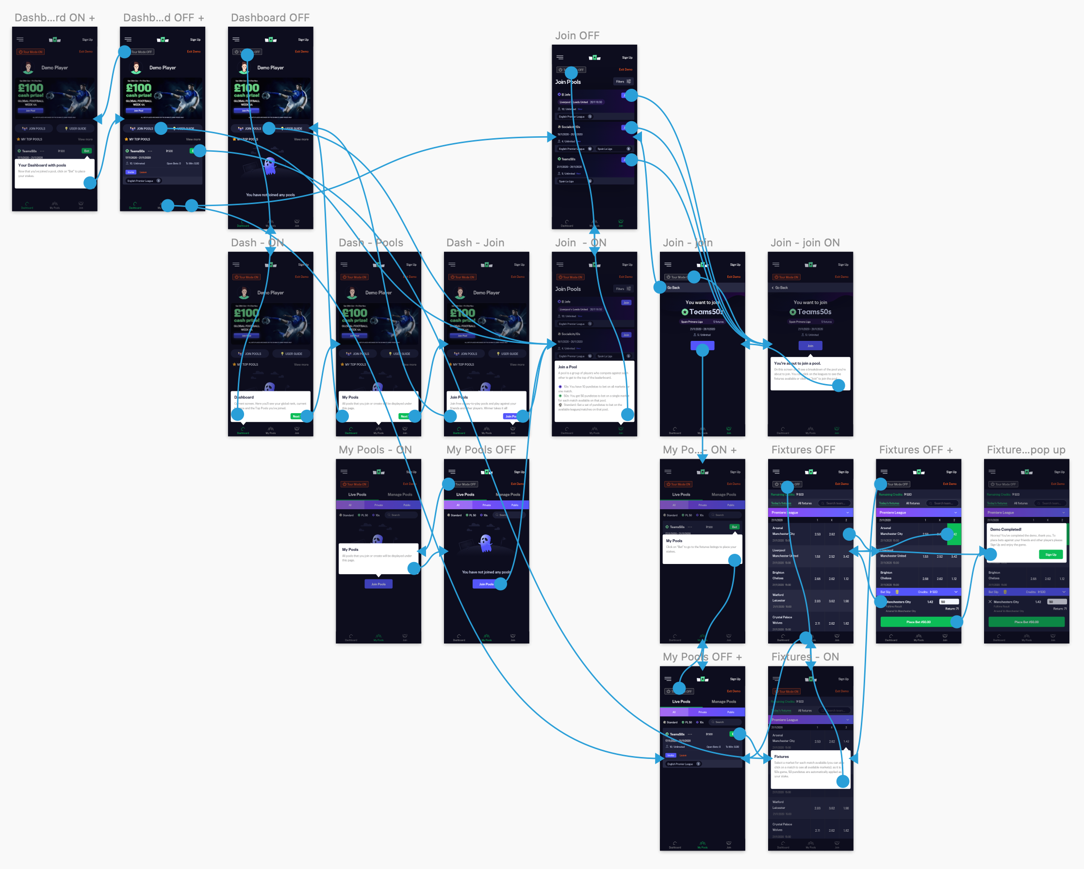 For this case study, I've put together the main user journey: from signing up until the user places a bet within a pool he/she has joined. After signing up, the user is re-directed to the dashboard, where the player information and "main" pools are displayed. The "My Pools" page will display all pools the user has joined.