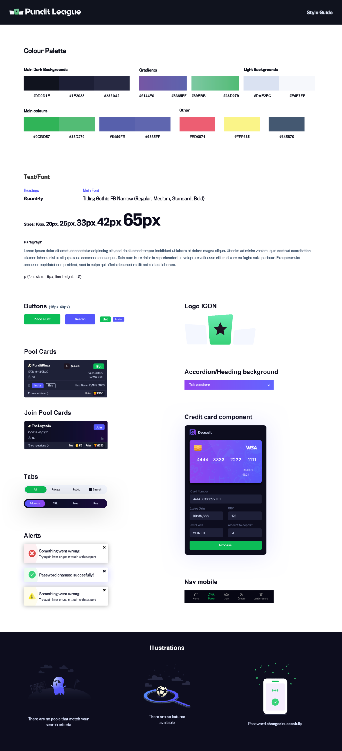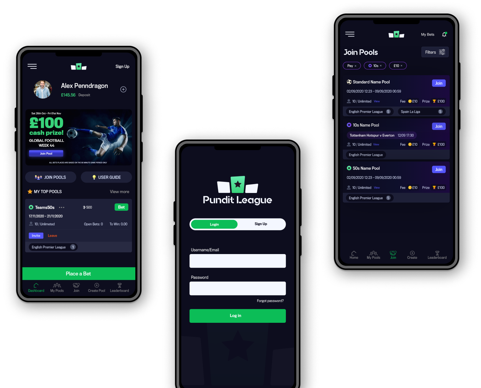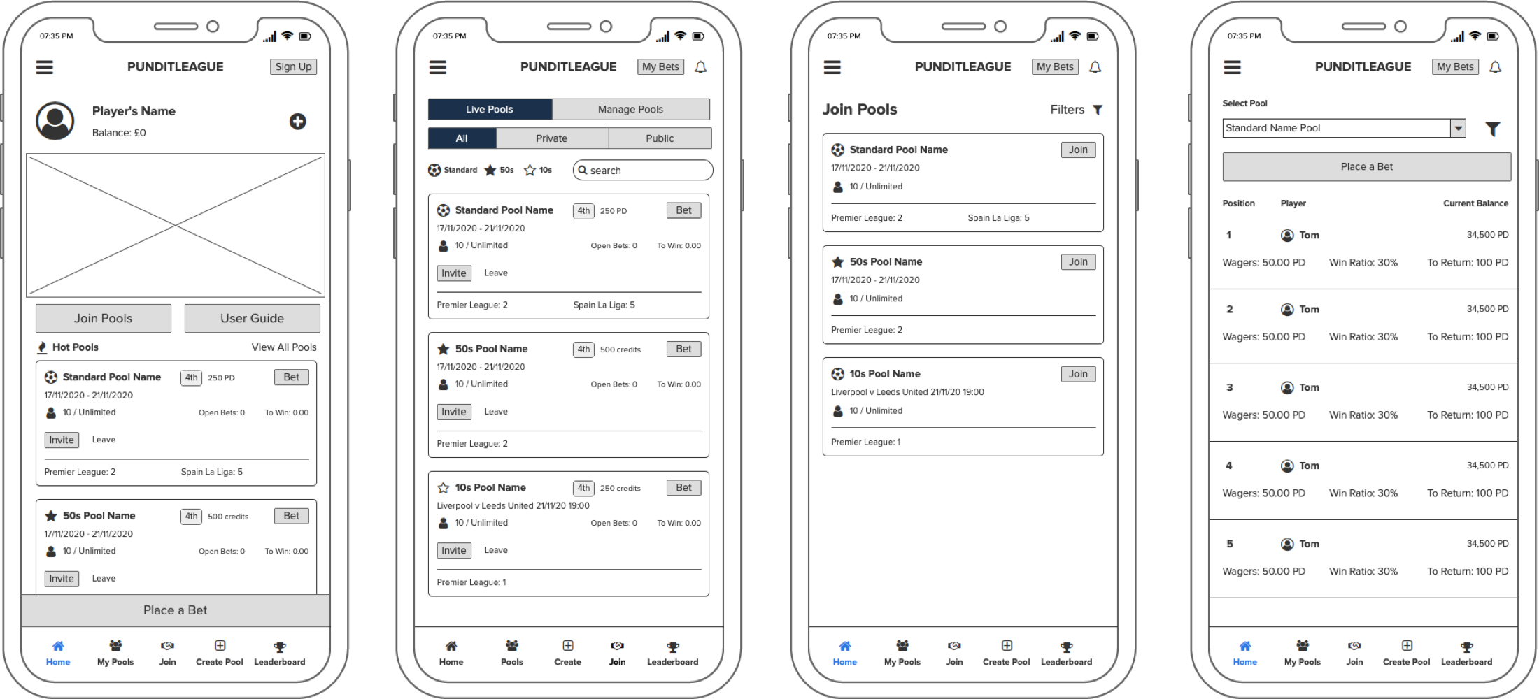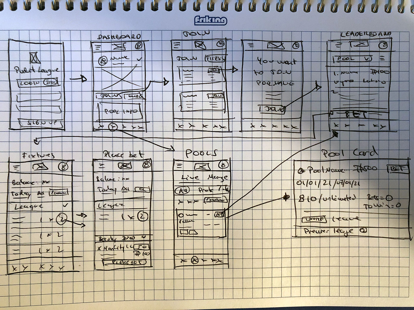 For this case study, I've put together the main user journey: from signing up until the user places a bet within a pool he/she has joined. After signing up, the user is re-directed to the dashboard, where the player information and "main" pools are displayed. The "My Pools" page will display all pools the user has joined.